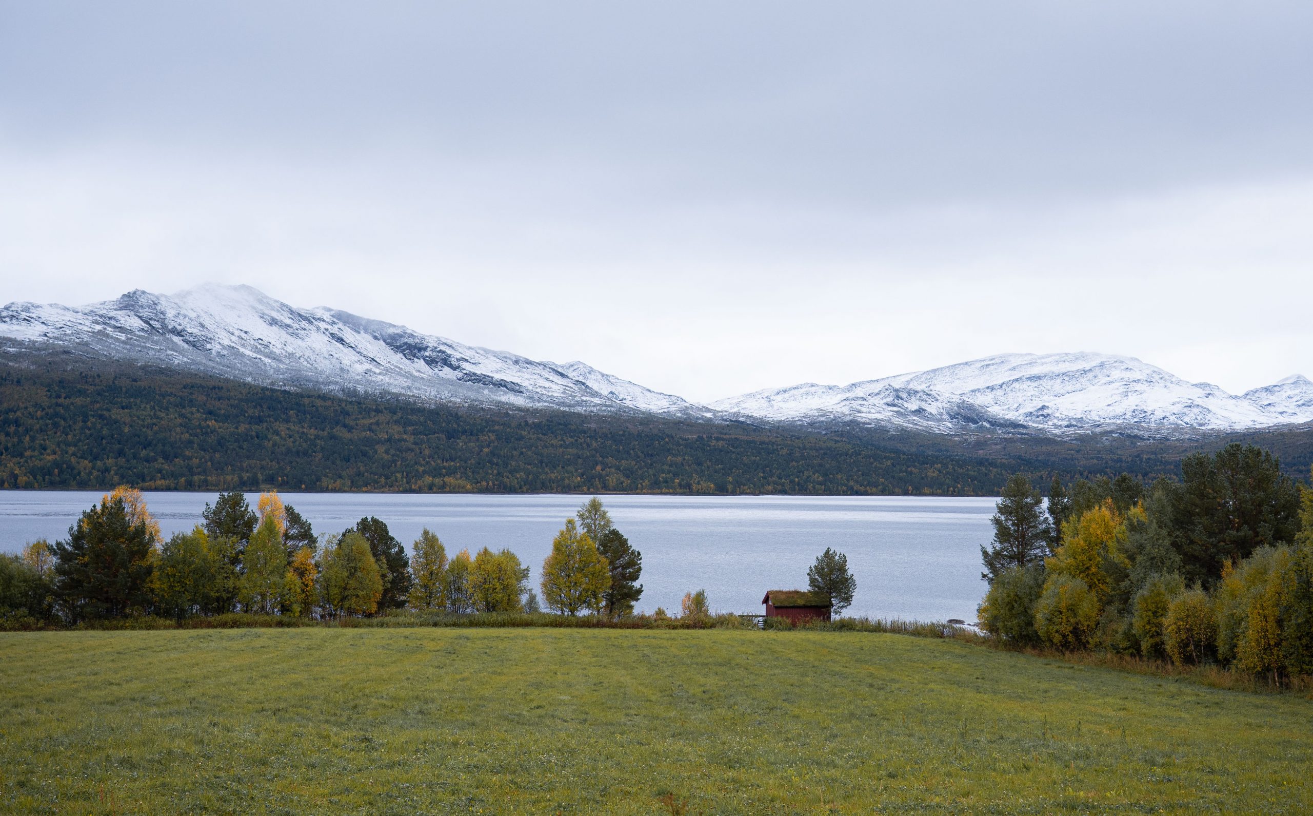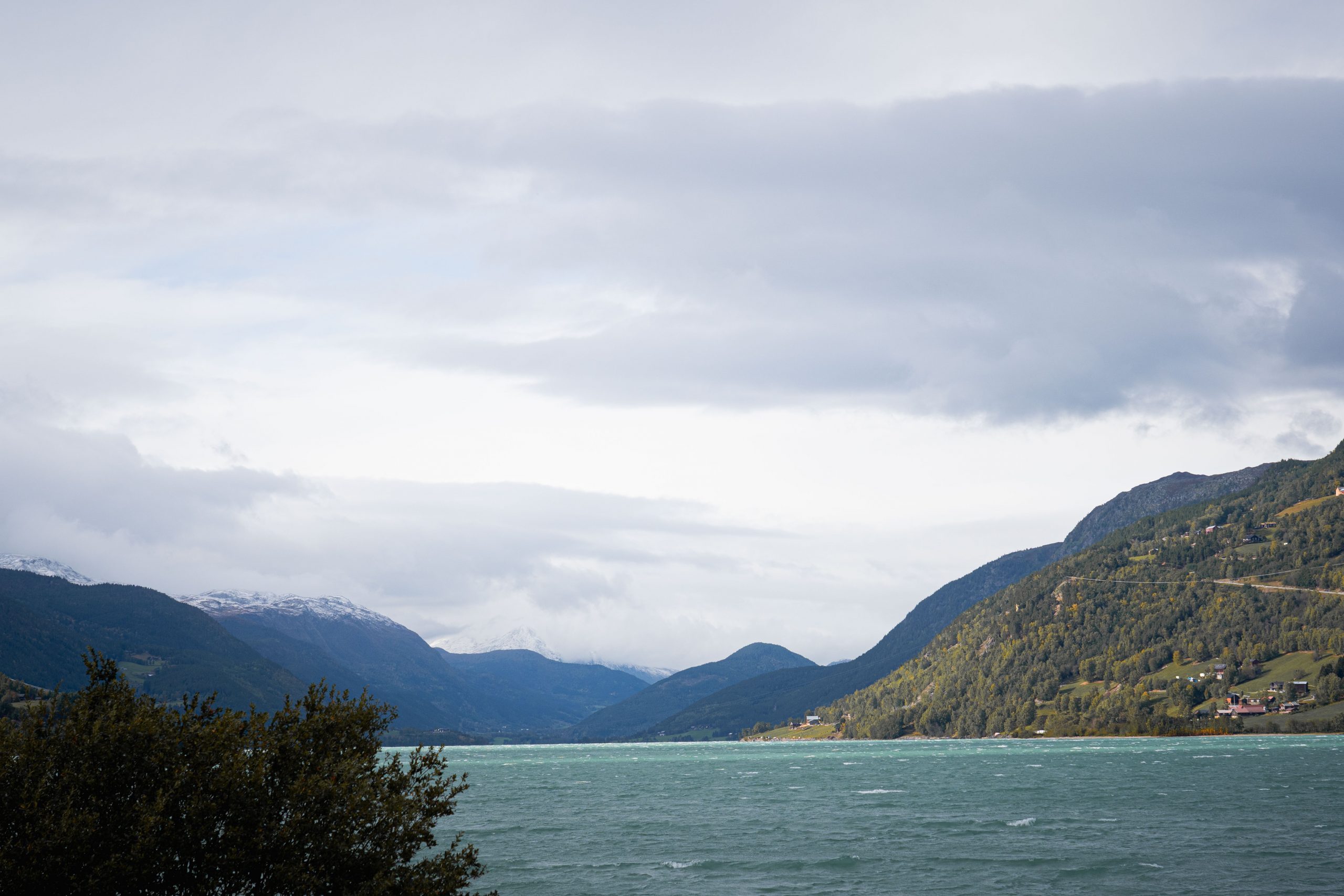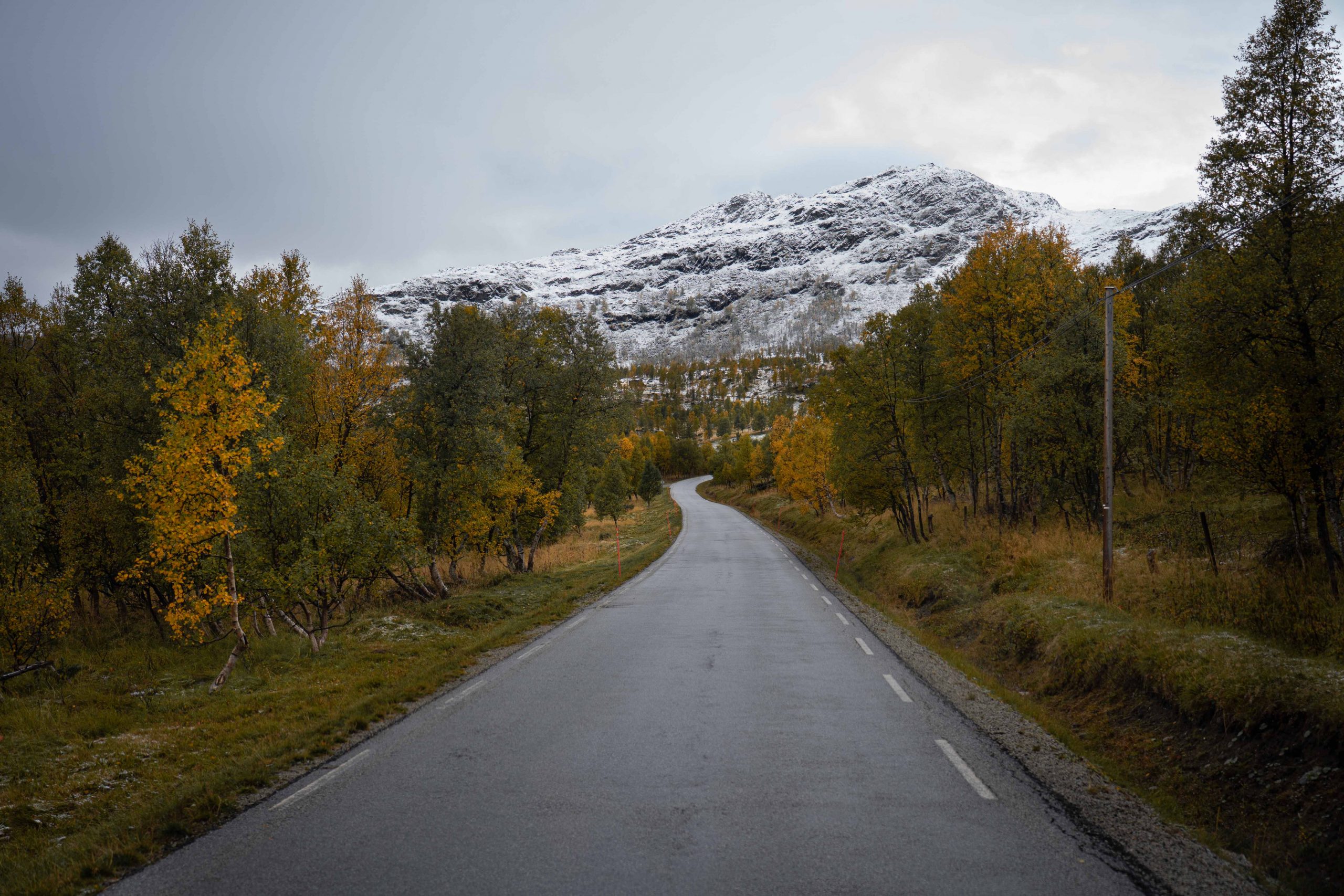 Der nächste Morgen überraschte uns mit gezuckerten Berggipfeln. Es war in der Nacht kalt gewesen, draußen waren am Morgen nur 2°. Als wir losfuhren, war das schon mit einem mulmigen Gefühl verbunden. Wir waren auf ca. 550 m.ü.M. und mussten noch das Fjell wieder herunterfahren. Aber es ging alles gut, die Straße war größtenteils frei.