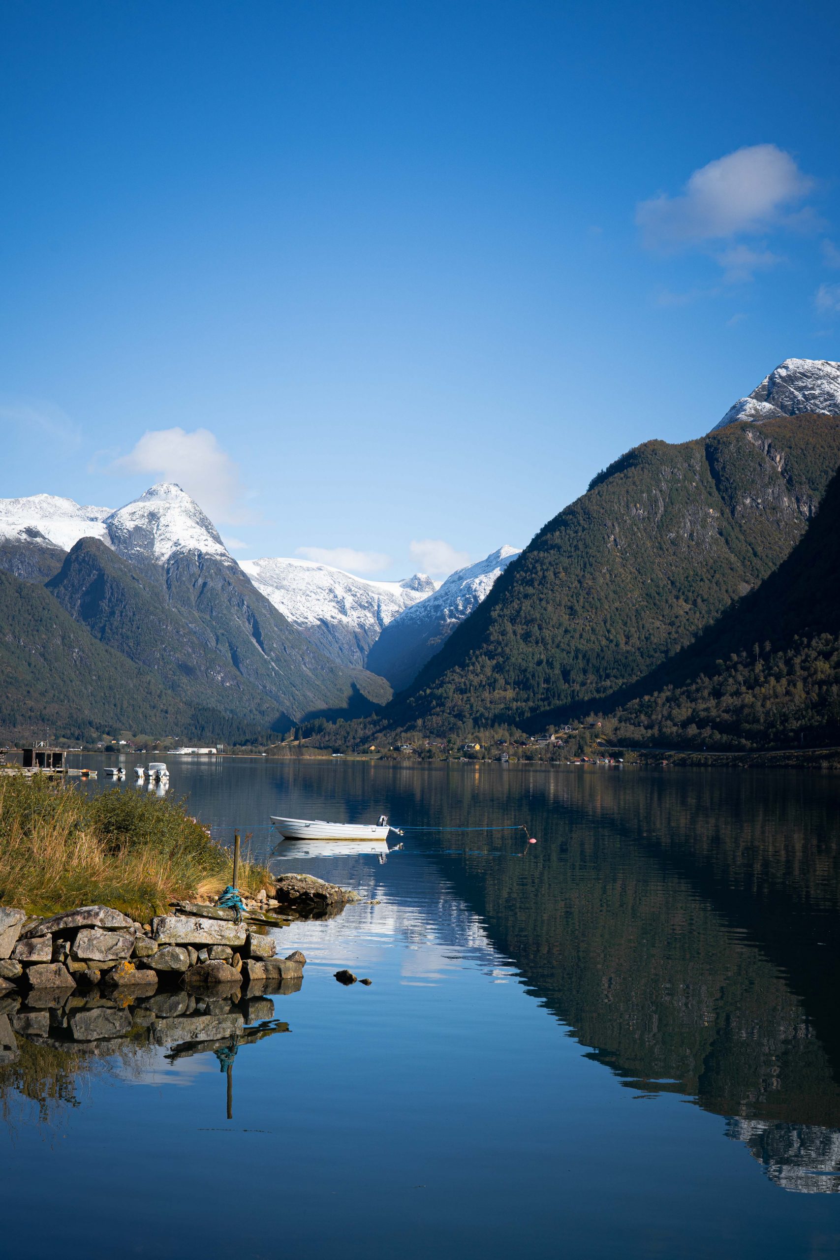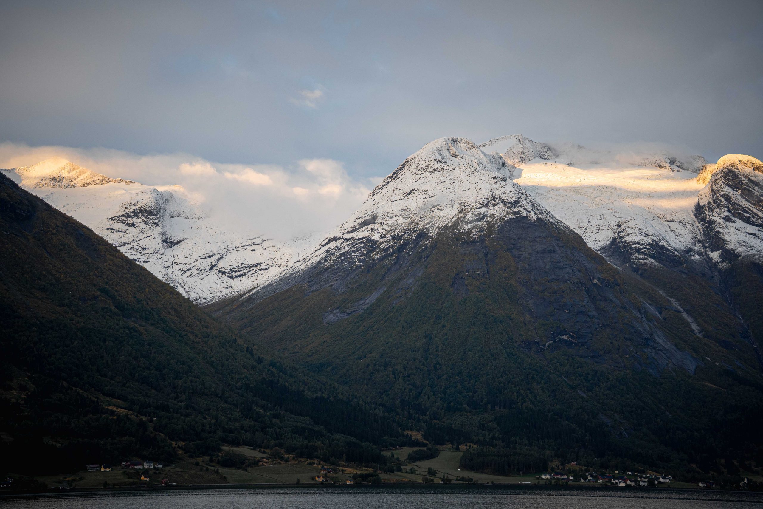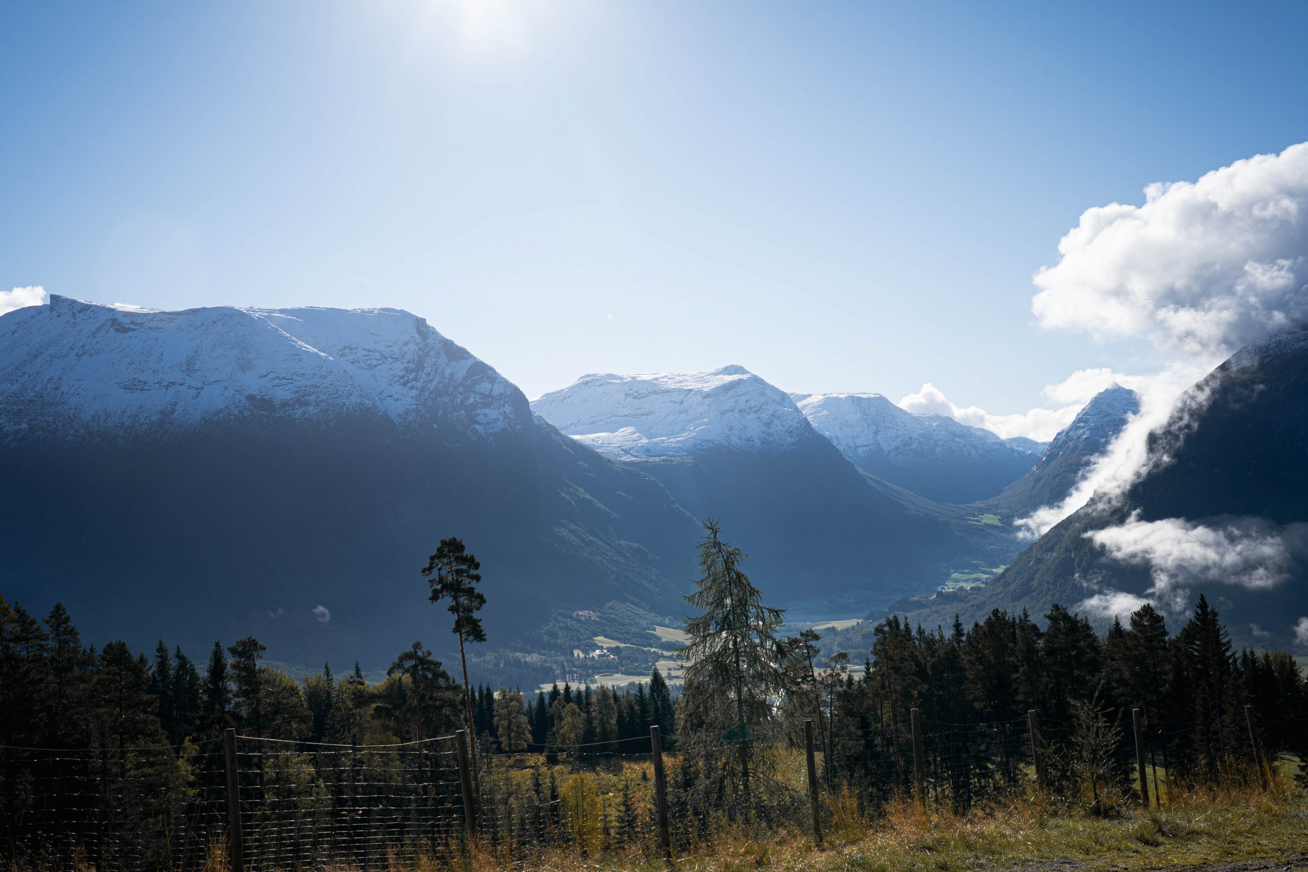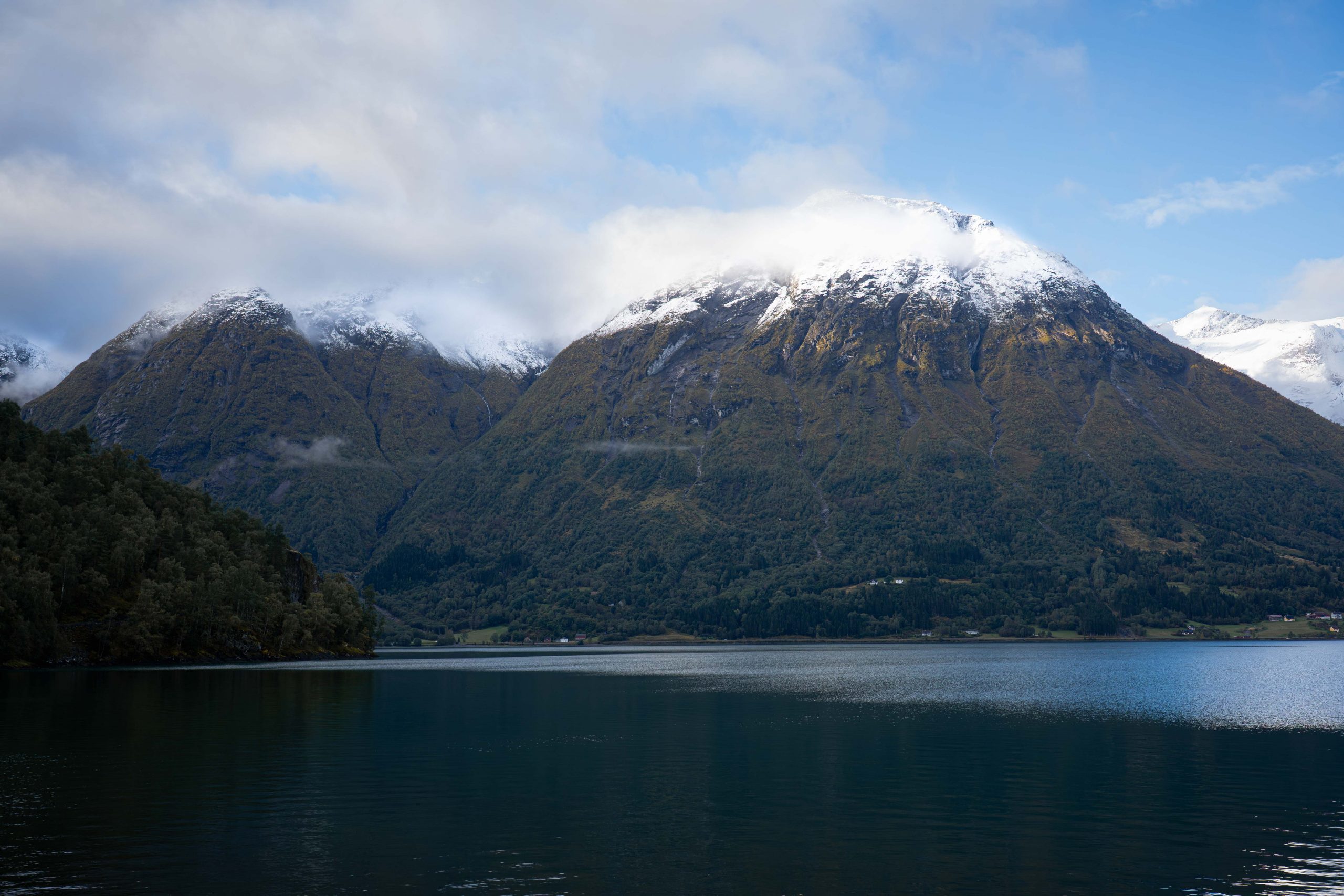 Der nächste Morgen überraschte uns mit gezuckerten Berggipfeln. Es war in der Nacht kalt gewesen, draußen waren am Morgen nur 2°. Als wir losfuhren, war das schon mit einem mulmigen Gefühl verbunden. Wir waren auf ca. 550 m.ü.M. und mussten noch das Fjell wieder herunterfahren. Aber es ging alles gut, die Straße war größtenteils frei.