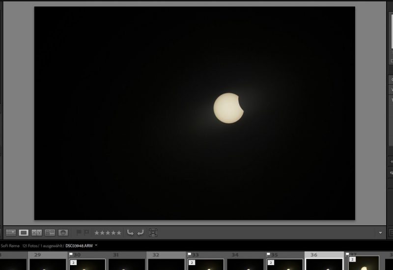 Die partielle SoFi auf Rømø im März 2025 habe ich mit meinem Tamron 50-400 und der Sony A7III (Vollformat) fotografiert. Ich habe dir hier einmal einen Screenshot aus Lightroom hochgeladen. Selbst mit der 400’er Brennweite ist die Sonne nur sehr klein auf dem Sensor. Wenn du also ein größeres Tele hast, nimm mindestens ein 400’er. Und natürlich fotografierst du eine SoFi nur vom Stativ. Stelle deine Kamera auf jeden Fall auf RAW ein, so hast du später in der Nachbearbeitung mehr Spielraum.
