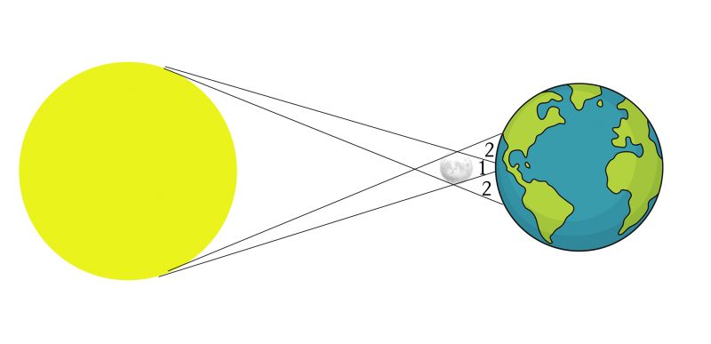 Während einer Sonnenfinsternis schiebt sich der Neumond zwischen Sonne und Erde. Der Mond ist zwar um ein Vielfaches kleiner als die Sonne, aber da die Sonne so weit weg ist, wirft der Mond einen Schatten auf die Erde und versteckt die Sonne. In den Bereichen „2“ herrscht der sogenannte Halbschatten. Hier siehst du nur eine partielle Sonnenfinsternis. Im Bereich „1“ befindest du dich im Kernschatten. Nur hier siehst du die Totalität, die vollständige Sonnenfinsternis.