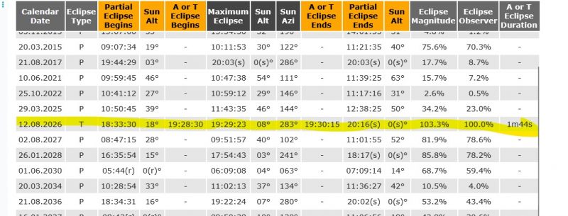 Am 12. August 2026 wird es gegen 19:30 wieder eine totale Sonnenfinsternis geben, die auch in Europa sichtbar ist. Der Sichtbarkeitskorridor geht von Ost-Grönland, West-Island und Spanien bis Mallorca. Für mich ist der Standort Spanien interessant. Grönland ist an der Stelle zu unwirtlich und in Island ist mir die Gefahr einer geschlossenen Wolkendecke zu hoch. Bleibt also Spanien.